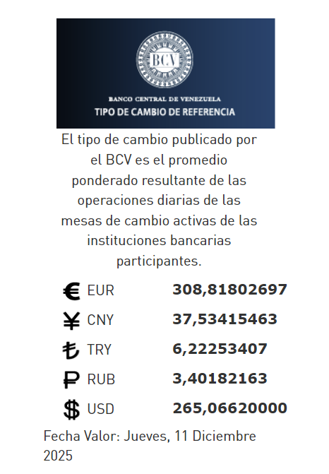 11-12-25.-El precio del dólar en el Banco Central de Venezuela (BCV) se cotizó este miércoles 10 de diciembre 2025 en Bs.265,06 por unidad según la última actualización en su página web oficial y redes sociales.