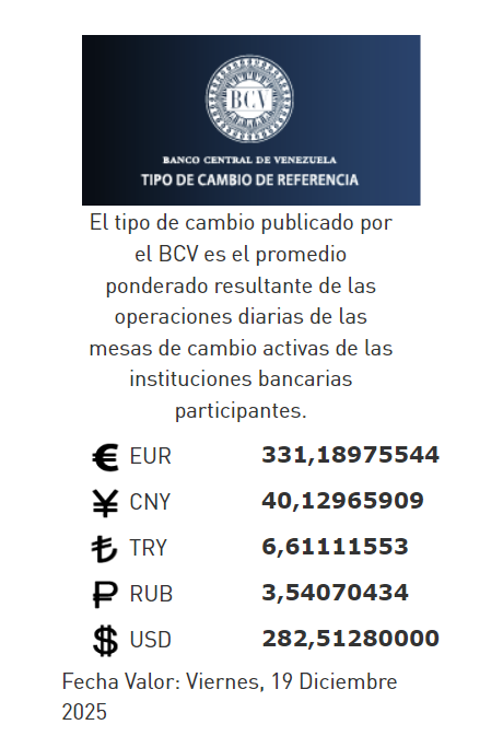 19-12-25.-El precio del dólar en el Banco Central de Venezuela (BCV) se cotizó este jueves 18 de diciembre 2025 en Bs.282,51 por unidad según la última actualización en su página web oficial y redes sociales.
