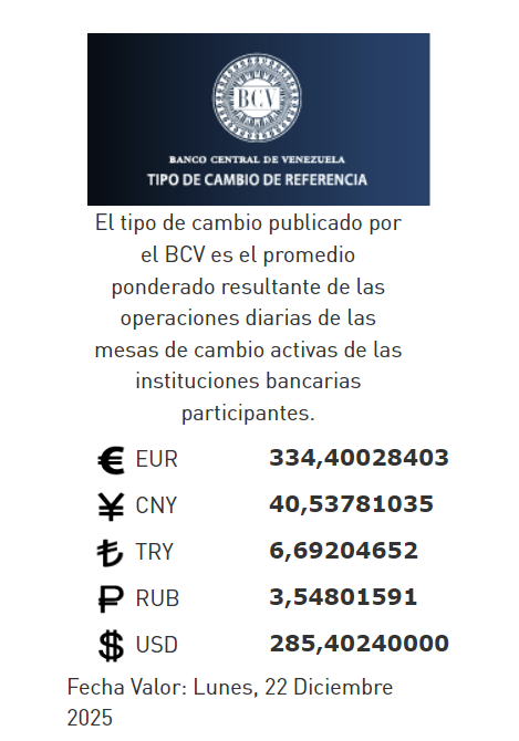 20-12-25.-El precio del dólar en el Banco Central de Venezuela (BCV) se cotizó este viernes 19 de diciembre 2025 en Bs.285,40 por unidad según la última actualización en su página web oficial y redes sociales.