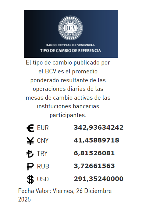 24-12-25.-El precio del dólar en el Banco Central de Venezuela (BCV) se cotizó este martes 23 de diciembre 2025 en Bs.291,35 por unidad según la última actualización en su página web oficial y redes sociales.