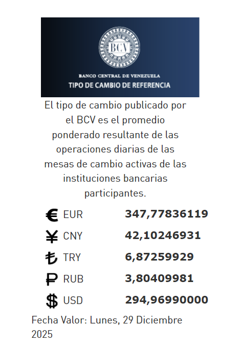 27-12-25.-El precio del dólar en el Banco Central de Venezuela (BCV) se cotizó este viernes 26 de diciembre 2025 en Bs.294,96 por unidad según la última actualización en su página web oficial y redes sociales.