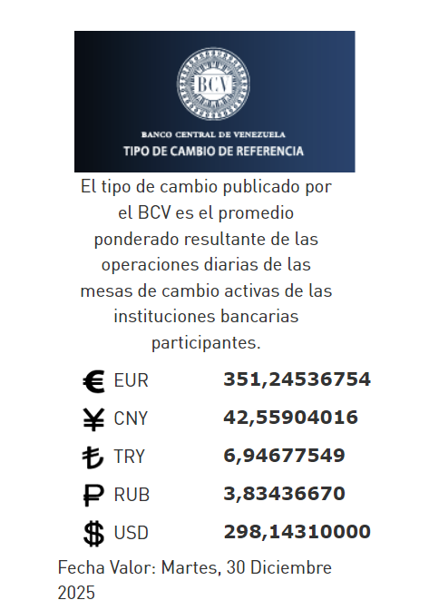 30-12-25.-El precio del dólar en el Banco Central de Venezuela (BCV) se cotizó este lunes 29 de diciembre 2025 en Bs.298,14 por unidad según la última actualización en su página web oficial y redes sociales.