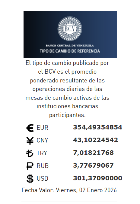 32-12-25.-El precio del dólar en el Banco Central de Venezuela (BCV) se cotizó este martes 30 de diciembre 2025 en Bs.301,37 por unidad según la última actualización en su página web oficial y redes sociales.