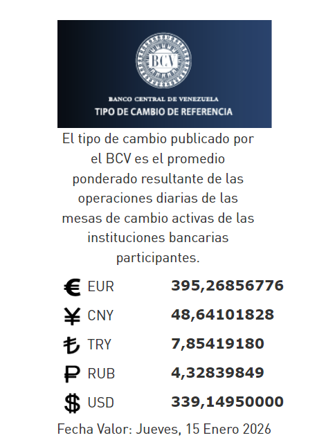 15-01-26.-El precio del dólar en el Banco Central de Venezuela (BCV) se cotizó este miércoles 14 de enero 2026 en Bs.339,14 por unidad según la última actualización en su página web oficial y redes sociales.