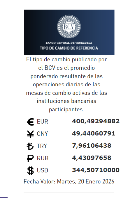 17-01-26.-El precio del dólar en el Banco Central de Venezuela (BCV) se cotizó este viernes 16 de enero 2026 en Bs.344,50 por unidad según la última actualización en su página web oficial y redes sociales.