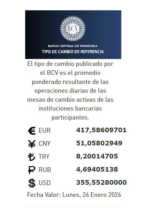 24-01-26.-El precio del dólar en el Banco Central de Venezuela (BCV) se cotizó este viernes 23 de enero 2026 en Bs.355,25 por unidad según la última actualización en su página web oficial y redes sociales.