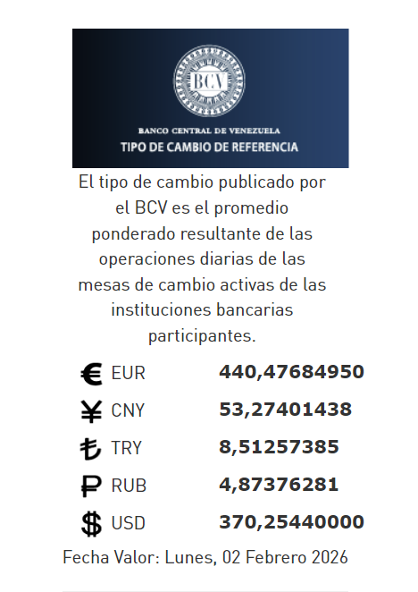 31-01-26.-El precio del dólar en el Banco Central de Venezuela (BCV) se cotizó este viernes 30 de enero 2026 en Bs.370,25 por unidad según la última actualización en su página web oficial y redes sociales.