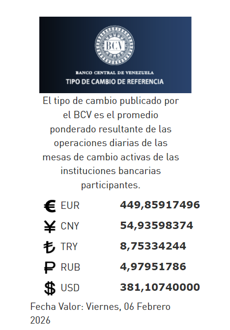 06-02-26.-El precio del dólar en el Banco Central de Venezuela (BCV) se cotizó este jueves 05 de febrero 2026 en Bs.381,10 por unidad según la última actualización en su página web oficial y redes sociales.
