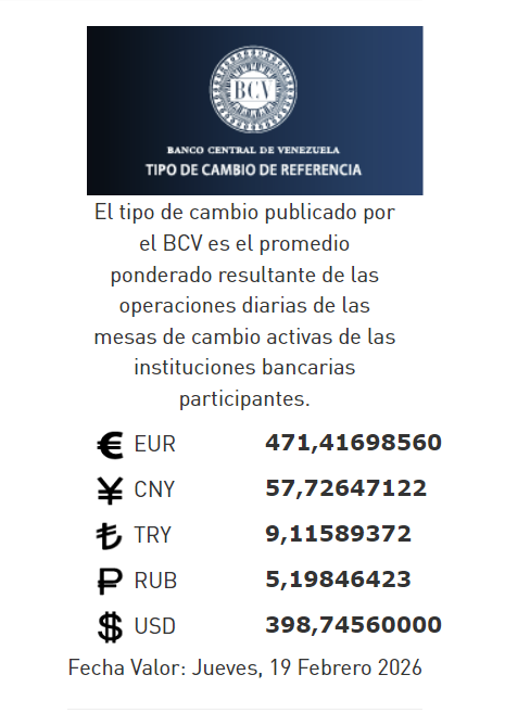 19-02-26.-El precio del dólar en el Banco Central de Venezuela (BCV) se cotizó este miércoles 18 de febrero 2026 en Bs.398,74 por unidad según la última actualización en su página web oficial y redes sociales.