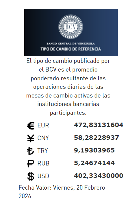 20-02-26.-El precio del dólar en el Banco Central de Venezuela (BCV) se cotizó este jueves 19 de febrero 2026 en Bs.402,33 por unidad según la última actualización en su página web oficial y redes sociales.