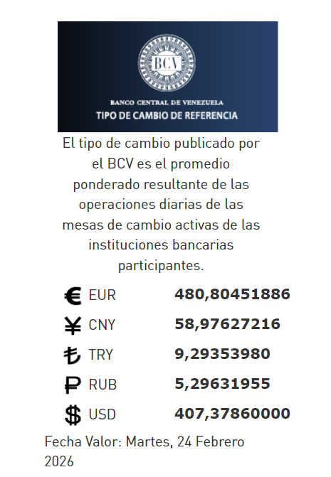 24-02-26.-El precio del dólar en el Banco Central de Venezuela (BCV) se cotizó este lunes 23 de febrero 2026 en Bs.407,37 por unidad según la última actualización en su página web oficial y redes sociales.