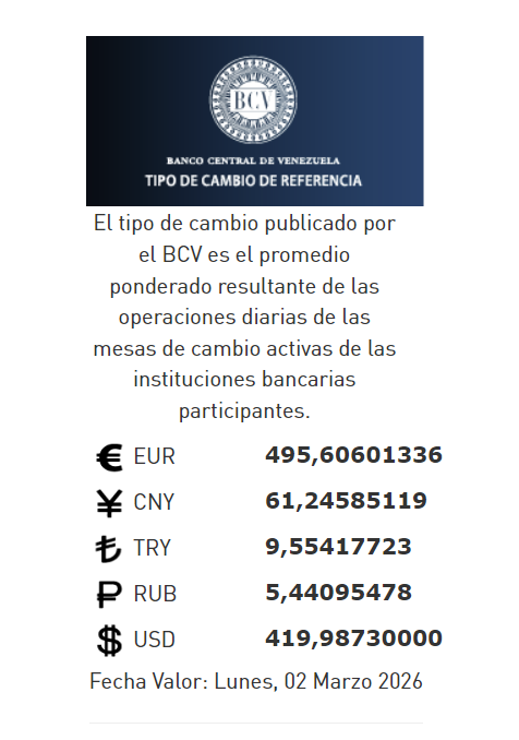 02-26.-El precio del dólar en el Banco Central de Venezuela (BCV) se cotizó este viernes 27 de febrero 2026 en Bs.419,98 por unidad según la última actualización en su página web oficial y redes sociales.