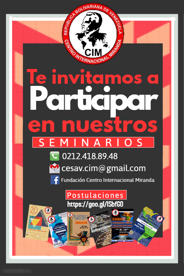 El Centro Internacional Miranda a través de su Centro de Estudios Avanzados (CESAV) recuerda a los participantes y al público en general la continuidad de los Seminarios como parte de su oferta formativa. Esta formación es totalmente GRATUITA y se está llevando a cabo en la Sede Centro Internacional Miranda Hotel Resd. Anauco, Parque Central, PH, Av. Bolívar. Caracas.