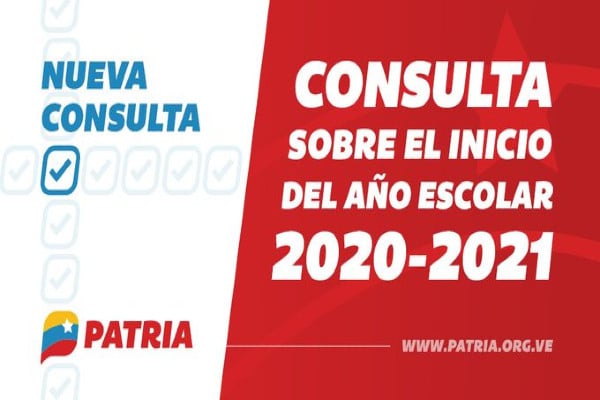 “Ya está disponible la consulta sobre el inicio del año escolar 2020-2021 en el Sistema Patria! El presidente Nicolás Maduro, gobierna con el pueblo, en aras de la protección de nuestros niños”, escribió la vicepresidenta Ejecutiva en la red social.