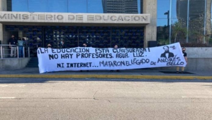 "La educación está clausurada. No hay profesores, agua, luz ni internet. Mataron el legado de Andrés Bello", rezaba una pancarta que portaban los estudiantes en medio de la protesta frente a la institución pública.