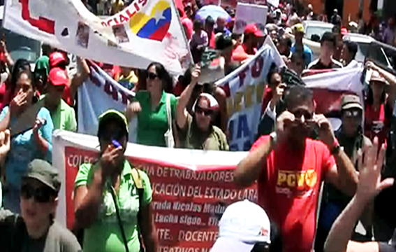 Algunas de las consignas: ``Somos trabajadores de la educación, con años trabajando, sin remuneración´´, ``Chávez vive vive, la lucha sigue sigue´´, ``La clase obrera unida jamás será vencida´´, `Oye patrón ven pa que veas este es el pueblo que te va a dar la pelea´´, ``Mas allá de conciliar es la hora de luchar´´,
