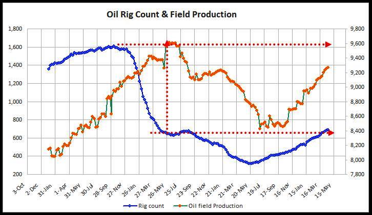 La respuesta estimada del comportamiento de producción basados en el nivel de actividad actual al 21 de abril de 688 taladros activos dedicados a crudo, sugiere que para el cierre del primer semestre de 2017 esta podría rondar 9.6 MMBD, significando una contribución neta a mitad de 2017 de 830.000 B/D.