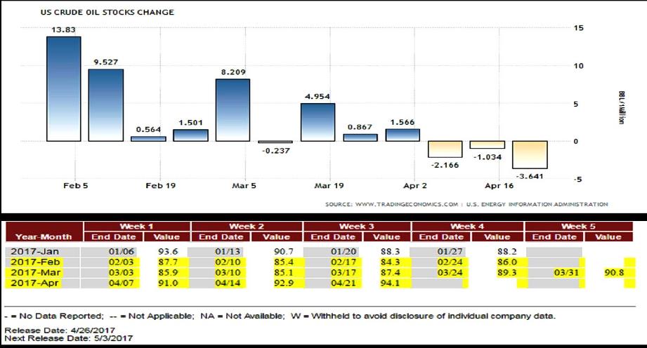 Pero basado en cifras oficiales, pareciera ser que la proyección que hace la OPEP sobre la evolución de la producción de crudo de EEUU luce bastante tímida, ya que solo entre el cierre de Diciembre 2016 y la tercera semana de Abril, dicha producción experimentó un crecimiento de 495.000 B/D.