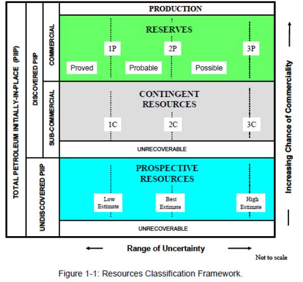 La Figura 1-1 es una representación gráfica del sistema de clasificación de recursos de SPE/WPC/AAPG/SPEE. El sistema define las clases principales de recursos recuperables: Producción, Reservas, Reservas Contingentes, y recursos Prospectivos, tanto como Petróleo No Recuperable. (3)