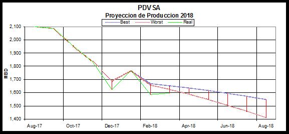 La figura anterior expone la comparación de la producción real (verde) versus la predicción efectuada a finales de 2017 en términos de dos escenarios posibles. Las expectativas en términos de mejora de la producción no se vislumbran en el panorama al menos en lo que queda de 2018, dificultando e impidiendo la monetización de cualquier eventual alza del barril ante el imparable deterioro. De continuar por esa vía, las consecuencias serán severas para la industria y Venezuela. Se detendrán operaciones y procesos selectivos por falta de insumos/servicios, estará cada vez más impedida de importar crudo y productos, se verá forzada a ceder mercados o vender crudos fuera de especificación a mayor descuento. La abrumadora caída de producción aunada a la galopante ineficiencia operacional continuara empujando los costos de producción a un nivel prohibitivo, llevando a marginal la operación. PDVSA tendrá forzosamente que reducir el tamaño de su FFHH y sus beneficios, y traerá consigo el "atizamiento" del entorno interno y con ello la probabilidad cierta de un escenario apocalíptico.
