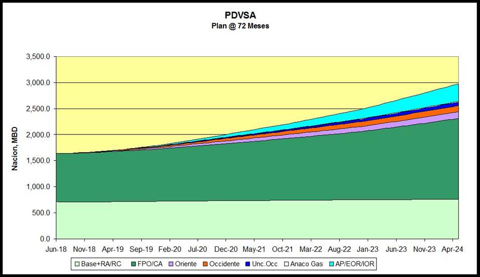 El plan a 6 años apunta a 2.9 MMBD y considera un barril a US$42.5 en previsión a la entrada de ese volumen perdido por las fallidas administraciones. Considera el MMBTU en US$1.1, asignado al uso exclusivo del desarrollo del parque industrial y termoeléctrico domestico. Posee varios componentes, inclusive la Faja Petrolífera del Orinoco y Costa Afuera, pero desde una perspectiva operativa y de negocios distinta. La actividad desplegada ameritaría un CAPEX lineal sostenido en el rango de US$2.7 a US$3.1 millardo, con una tasa de descuento del 10% y una depreciación del 12%, con lo cual se apuntaría hacia un UTC de US$5.8 a US$6.1 per barrel.