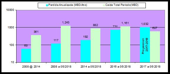 No se debe perder de vista, que de cumplirse los pronósticos para Mayo’2018, la producción podría ceder a entre un máximo de 1.460.000 B/D y un mínimo de 1.390.000 B/D. Con ello el descenso total respecto al cierre 2017 sumaria unos 607.000 B/D y la baja anualizada al cierre de 2018 podría superar 1.030.000 B/D. Un escenario verdaderamente catastrófico para Venezuela y sobre todo para la estabilidad política del país, por las implicaciones que ello tiene sobre los flujos de ingresos y el cumplimiento de un denso abanico de compromisos internacionales.