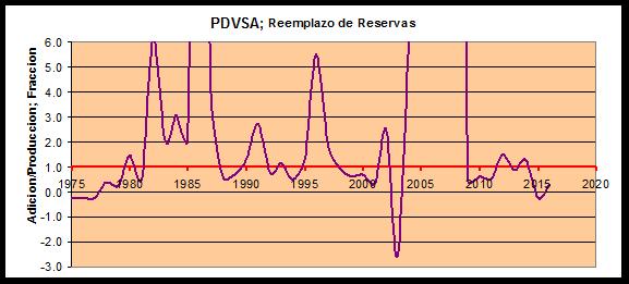 Las reservas hidrocarburíferas criollas son una verdadera espada de Damocles para Venezuela. PDVSA no ha sabido incorporarlas como potencial, desarrollarlas y menos sostener su crecimiento. Luego de la nacionalización el factor de reemplazo de reservas fue primordialmente negativo; es decir, se producía más de lo que se sumaba como reservas frescas, salvo algún paréntesis entre 1982-1987, cuando las reservas pasaron de unos 19 MMMBbls a 58 MMMBbls. Luego de allí, por más de una década “la PDVSA meritocratica” fue sumamente tímida en la incorporación de reservas a pesar del ingente gasto en exploración, volviendo a mostrar fundamentalmente reemplazo negativo de reservas hasta el entorno de 1996-1998 cuando topan los 76 MMMBbls.