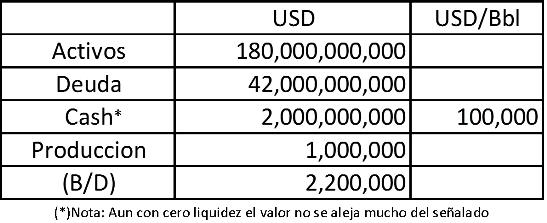 Nos imaginamos que dicho monto fue propuesto con base en el concepto de costo de un barril, bajo el entendido de nuevos procesos o nuevas licencias de explotación (CPFB), por lo casual de su génesis [US$100.000MM/1MMBD= US$100.000 pb]; sin embargo y asumiendo el riesgo de equivocarnos en dicha aseveración (y ojala que así sea), dicho calculo no incluye el valor de las reservas, presupone total destrucción de la infraestructura (lo cual no es el caso), un escalamiento de 100.000 B/D/Año y se limitan sus otros activos. Como ejemplo, en Alberta dicho costo posee un rango de C$22.000 y C$79.000 per boe.