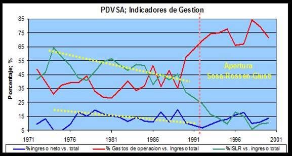 Los resultados de la gestión de PDVSA a partir de los 90, precisamente cuando "esfervecia" la apertura petrolera y explotaba la fiebre de la privatización, no llegaron a ningún lado. Por el contrario, apuntaron a reducir las ganancias del estado. Los mismos resultados de gestión producto de dicha apertura, señalaron a la postre que en esencia PDVSA se había convertido en una empresa costosa y en consecuencia ineficiente.