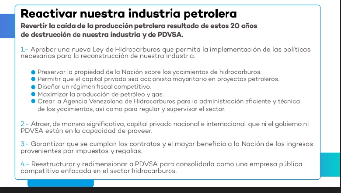 En materia petrolera, su esencia ha sido resumida en unos pocos puntos entre los cuales destaca la abierta intención de una expresa privatización del negocio petrolero y que por ahora, y hasta que el primer punto de su propuesta (lease: aprobar una ley de hidrocarburos que permita la implementación de políticas necesarias para la reconstrucción de nuestra industria) haya sido expuesto, aprobado y hecho ley, no incluye la privatización del recurso en el subsuelo como tal, pero que de seguro dicha "nueva ley" podría traer consigo, en cuyo caso plantearía para el futuro cercano, una copia fiel del concepto de propiedad vigente en los estados unidos, en materia de propiedad de minerales y demás riquezas contenidas en el subsuelo.