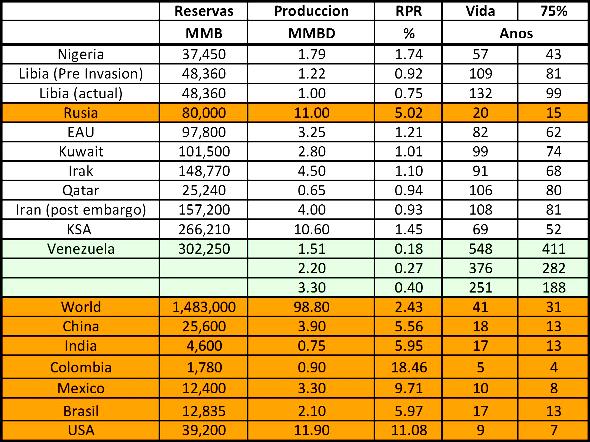 De no añadir sustancialmente reservas, a Colombia le quedan solo alrededor de 4 años, EEUU unos 7, Brasil 13, China 13. Saquen ustedes sus propias conclusiones. En America, entre el Ártico y el Antártico, no quedaran muchos de pie, sino "prácticamente" un solo suplidor; Venezuela. El caso particular de Argentina con sus reservas especulativas de Shale oil en "vaca muerta", aun está por verse, así como las reservas del ártico.