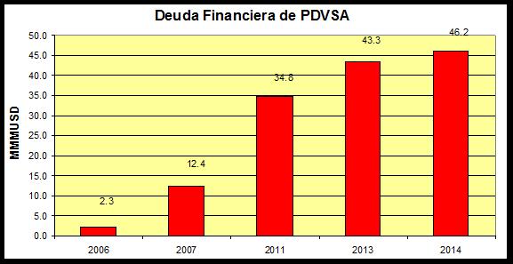H. Chávez fue convencido a comprometer producción futura para tener acceso a empréstitos realmente no requeridos para entonces. China y Rusia le dieron al gobierno de entonces la zanahoria y ese gobierno erróneamente la compró. Como consecuencia de tales torpezas, nuestra industria permanece hoy prácticamente sin producción propia y empeñada, con una deuda financiera que ha escalado US$2.3 MMM en 2005-2006 a más de US$46 MMM en 2014; un incremento de alrededor del 2.000 %. Se estima que para el cierre de 2018, la deuda financiera de PDVSA se encuentre en el entorno de US$32.3 @ US$32.8 MMM.