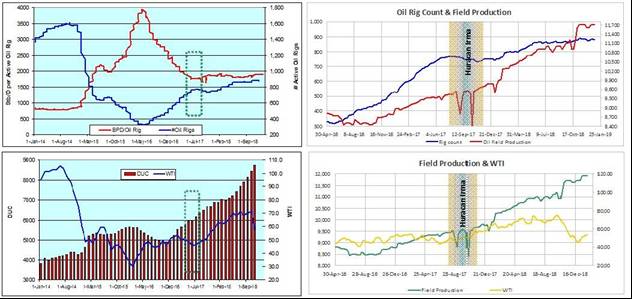 Si examinamos la información histórica disponible (IEA), es posible identificar algunas variables, que pudieran ayudar a dar respuesta a dicha interrogante. A pesar de la abrupta caída en los barriles producidos por cada taladro-día activo, al haber variado de alrededor de 3.900 B/D por taladro-día activo a mediados de 2016, a menos de 2.000 B/D por taladro-día activo en la actualidad y aun en presencia de una menor cantidad de taladros activos, la producción aun se muestra al alza.