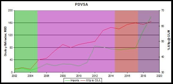 Desde 2002 hasta el presente la fracción de crudo X/Xp en la producción nación ha ido en franco incremento, moviéndose en fase y a la par de las importaciones de crudo y refinados. Entre 2002 y 2019 el porcentaje de crudos X/Xp; precisamente los más contaminantes, ha pasado de un 32% al 63% promedio-año mientras que el volumen de importación de crudo y refinados, ha escalado durante el mismo periodo desde 11.000 B/D a 181.000 B/D promedio-año. En retrospectiva;