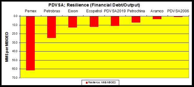 Pero no todo es malo y aun así la capacidad de resiliencia de PDVSA es asombrosa; aun en la condición de destrucción actual. A condiciones de 2006 nuestra industria estaba mejor posicionada que Pemex, Petrobras, Exxon, Petrochina e incluso Aramco en términos de capacidad de endeudamiento e ingresos netos como proporción al barril producido.