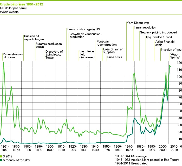 La siguiente gráfica de la petrolera británica BP (que se puede obtener revisando sus reportes estadísticos anuales del mercado petrolero) recoge los precios promedios anuales del barril de petróleo medidos en dólares de los Estados Unidos, entre 1861 y 2019, a nivel global. La línea oscura da cuenta de los precios nominales de cada año. Mientras que la clara hace lo mismo pero en dólares de 2012, deflactados por el Índice de Precios al Consumidor de los Estados Unidos.
