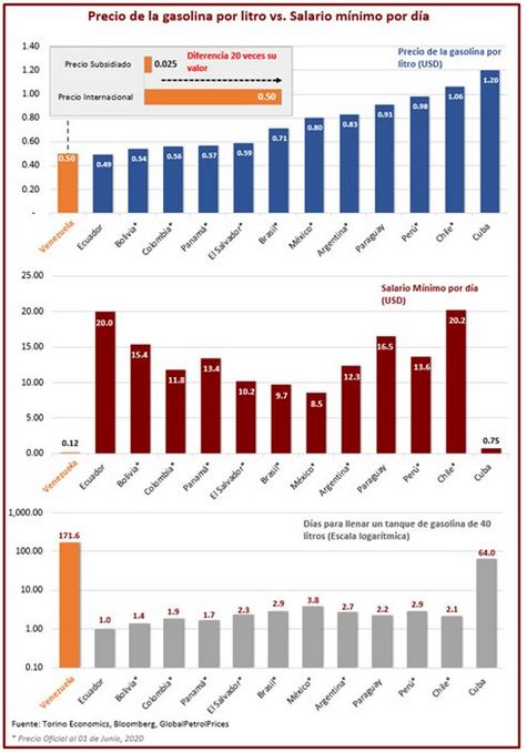 Los precios diferenciados introducen más desigualdades sociales: Sobra decir que la diferenciación del precio beneficia a los que tengan mayor poder adquisitivo, con lo cual, la adquisición de combustible se convierte en un privilegio. Sin duda hay que establecer precios racionales, pero eso implica que estén en correspondencia con la capacidad adquisitiva de la mayoría de la población. Según datos de la consultora privada Torino Economics, se requieren 171 días de salario para llenar un tanque con 40 litros de gasolina a “precio internacional” (ver imagen). El precio de $ 0,50 representa cerca del 25% del salario mínimo vigente y adquirir 40 litros de gasolina subsidiada equivale a la mitad del mismo. Tal desproporción entre el sueldo mínimo y el precio del combustible no tiene precedentes en Venezuela, y difícilmente en cualquier otro país.