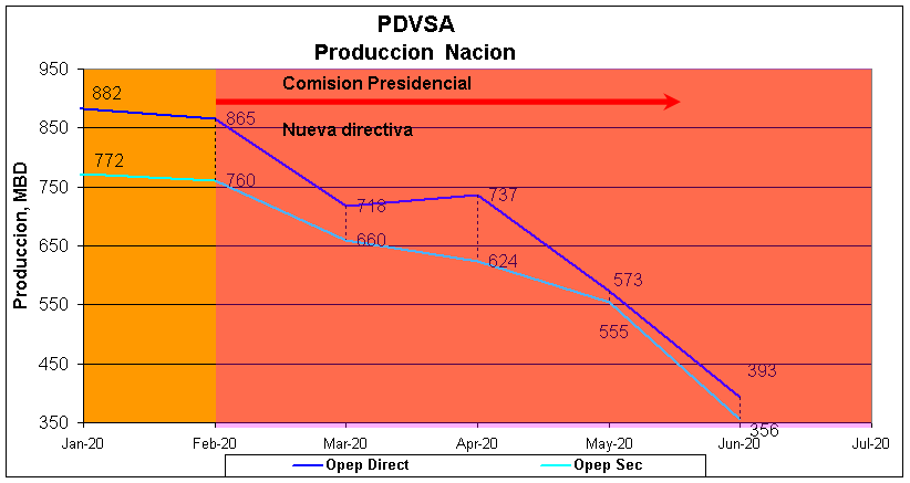 Luego de un deplorable mes de Junio donde la producción se abatió hacia 393/356 MBPD (OPEP directo/secundario), el derrumbe desde la instalación de la comisión presidencial hasta Junio’2020, acumula 472.000/404.000 BPD. PDVSA luego de 2008 no tiene merito que mostrar, habiendo pasado de producir 3.260.000 BPD al cierre de 2008 a 393.000 BPD al cierre de Junio, representando un desplome de 2.867.000 BPD; es decir 88% desde entonces.