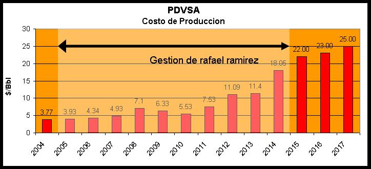 Imposible comprender como se permitió que los costos de producción de PDVSA pasaran desde $3.7 y $3.9 por barril luego del sabotaje y antes de la entrada de rafael ramírez, a más de $18 por barril entre 2005 y 2014, para luego elevarse $24 @ $27 en la actualidad sin que nadie desde el mismo gobierno lo haya notado.