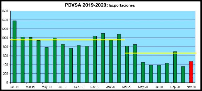 Dichos 18 cargueros podrían reducir la presión sobre los inventarios entre un minino de 11 y un máximo de 14 MMBbls, equivalentes a un rango en la tasa de exportación de entre 370 y 470 MBD. Aun con esos 18 cargueros el nivel de exportación en el mejor de los casos no superaría el ya deprimido promedio año de 642 MBD mostrado hasta el cierre de Octubre. Entre sanciones y caída en el potencial de producción, PDVSA ha dejado de exportar unos 721.000 BPD entre Febrero y Octubre 2020.