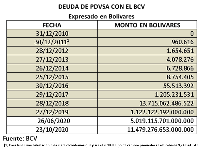 Esta situación, como se puede observar en el siguiente cuadro (deuda de Pdvsa con el BCV), se inició en 2010 y se ha ido haciendo cada vez más crítica al pasar de los años, a pesar del impedimento legal (Ley del BCV, artículo 37) y constitucional (artículos 318 y 320) que existe, entre otros, en cuanto al financiamiento del BCV a las empresas del Estado.