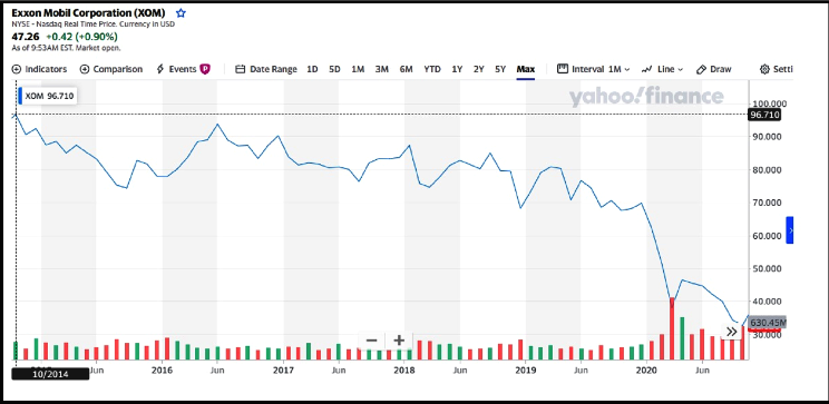 Sus acciones han pasado de unos $93 en 2014 a menos de $32 en Octubre’2020 para ubicarse hoy alrededor de los $47, habiendo sufrido una descompensación cercana al 50% en su valor. Aun con toda la propaganda y anuncios de recurrentes supuestos éxitos, dicha corporación no ha terminado de captar la atención de los inversionistas, continuando el desplome de sus acciones, desde el inicio mismo de sus operaciones en Guyana el 20/12/2019.