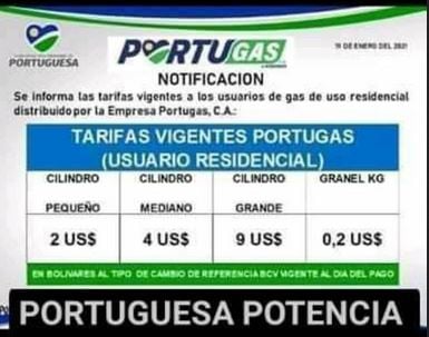 El Presidente de PORTUGAS publico por su redes sociales en nuevo incremento en DOLARES de las bombonas que a partir del 18 de enero del presente año, una bombona de gas de 10 Kg costara 2 $ , la de 18 Kg 4 $ y la de 43 kg 9$ (ver anexo). no publico los precios para el servicio de gas comercial pero lo que cierto que en PORTUGUESA el gas va ser un articulo de lujo lo que puede traer graves consecuencia porque, que trabajador público o familia de bajo ingreso va a poder comprar gas a eso precios, lo que llevaría a emigrar a cocinas eléctricas y por ende a aumentar el consumo eléctrico produciendo más apagones etc....
