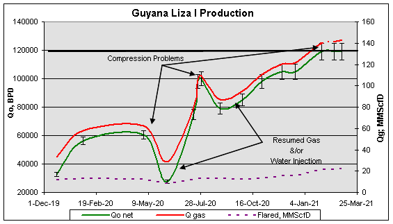 La información que se muestra seguidamente ha sido reconstruida a partir de declaración oficial de prensa, donde es fácil advertir una producción errática, con una creciente fracción de gas y un alto componente de fallas operacionales. Ciertamente la producción ha ido en aumento, pero al costo de una operación deficiente y de la destrucción del medio ambiente. No hay que olvidar que operan un yacimiento virgen y la evidente alza en la relación de gas a petróleo, advierte un consumo energético contra productivo que terminará por pasar factura más pronto que tarde.