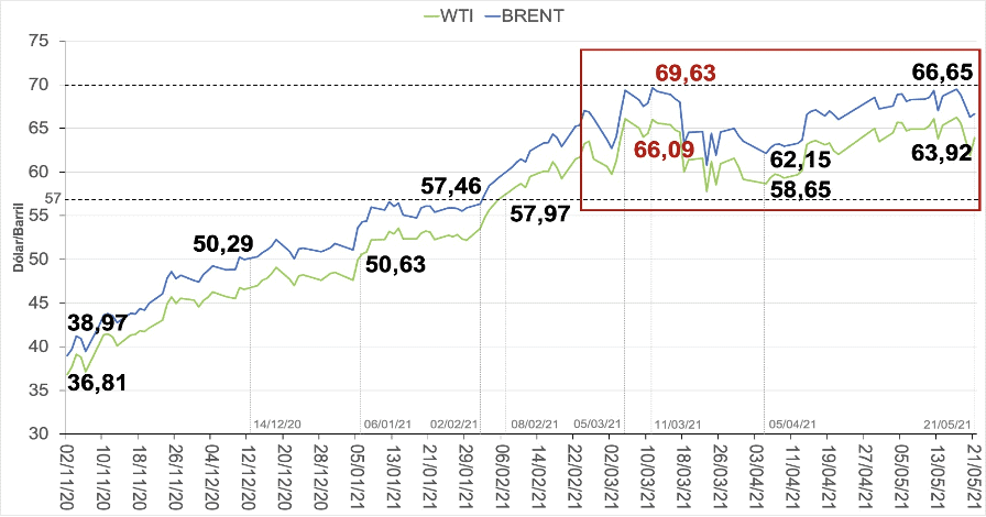 Los marcadores principales de precios del crudo, el Brent y el WTI, se han visto impactados la tercera semana de mayo tanto por situaciones de orden político, como por situaciones de orden financiero que han afectado sus cotizaciones a la baja.