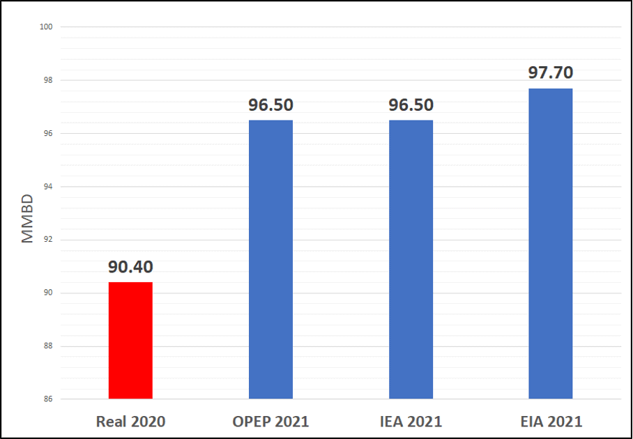 La Agencia Internacional de Energía (IEA, por sus siglas en inglés), coincide con la OPEP al tiempo que mantiene su proyección de demanda para el año en curso. Mientras que la Administración de Información de Energía de los Estados Unidos, (EIA por sus siglas en inglés), prevé un incremento mayor de la demanda, 1,2 MMBD por encima de la estimación de la OPEP/IEA, para ubicarla en 97,7 MMBD.
