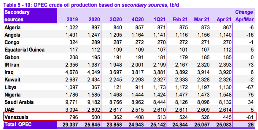 De acuerdo al último Reporte de Monitoreo del Mercado (MOMR por sus siglas en inglés) de la OPEP, la producción de petróleo de Venezuela, presentó una caída de 81 mil barriles diarios de petróleo respecto al mes anterior, para ubicarse en 445 mil barriles día de petróleo, una caída del 85 % respecto a los niveles de producción de 3,015 millones de barriles día del 2013.