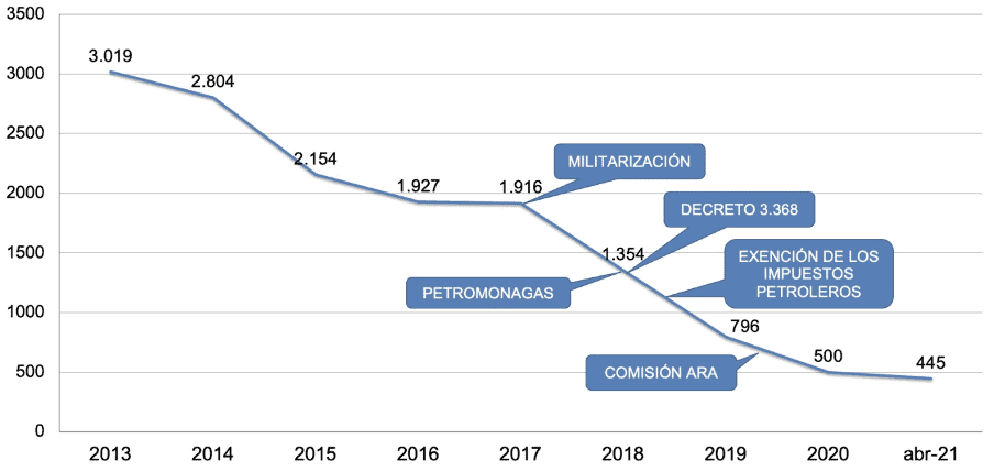 Los resultados fueron desastrosos, no solo no se incrementó la producción en un millón de barriles día como prometió el gobierno, sino que la misma cayó desde el nivel de 1,9 millones de barriles día de diciembre de 2017 –cuando inicia la militarización– hasta 500 MBD, una caída de 1,4 millones de barriles día, una caída de 74% entre 2017-2020, hasta que sale el general Quevedo y se instala una nueva comisión interventora de PDVSA, la Comisión ARA (Alí Rodríguez Araque) en febrero de 2020.