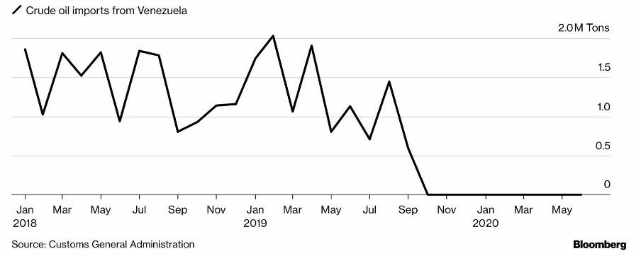 Las empresas estatales chinas, siguieron importando petróleo venezolano hasta el 2019, cuando decidieron no mantener el intercambio ante los incumplimientos desde PDVSA, que a partir del 2017 comenzó a incumplir la mayoría de los acuerdos de suministro como Petrocaribe, China, entre otros, cediendo a la presión de los EE.UU. y las sanciones contra las exportaciones de petróleo venezolano.