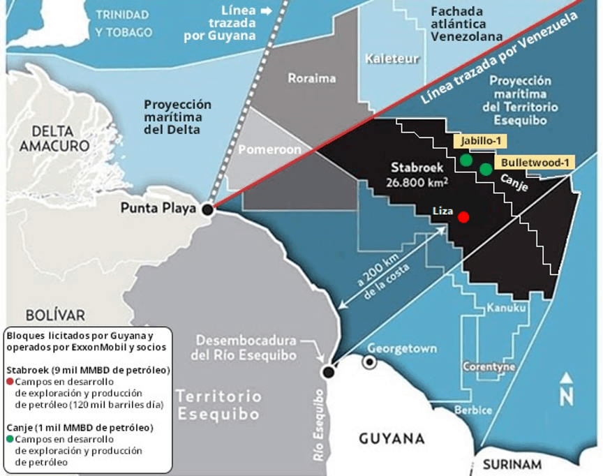 El incremento de la actividad petrolera y el desarrollo de infraestructura de producción y procesamiento de petróleo y gas en las aguas del territorio Esequibo en disputa con Venezuela, van configurando de hecho un despojo del territorio y recursos, pasando por encima del acuerdo de Ginebra y del derecho soberano de Venezuela a controlar y desarrollar los recursos naturales en su plataforma Continental, y preservar su acceso a la fachada Atlántica.